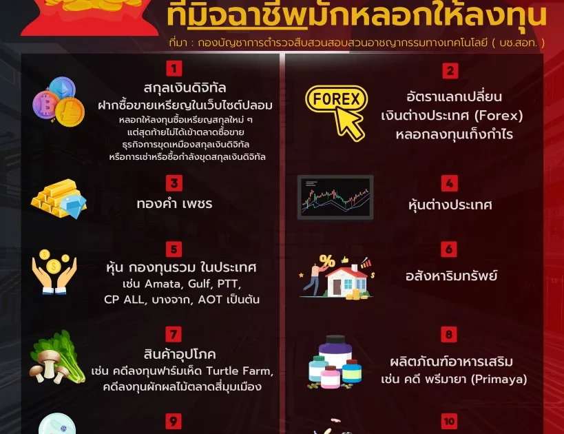 10 รูปแบบธุรกิจ – สินทรัพย์ ที่มิจฉาชีพออนไลน์มักหลอกลวงให้ลงทุน ตำรวจไซเบอร์เตือนภัย! โจรออนไลน์หลอกลงทุน โดยจากสถิติการรับแจ้งความฯ พบว่า ตั้งแต่วันที่ 1 มีนาคม 2565 ถึงปัจจุบัน มีประชาชนได้รับความเดือดร้อนจากการถูกมิจฉาชีพหลอกลวงให้ลงทุนผ่านระบบคอมพิวเตอร์กว่า 23,200 ราย สูงเป็นลำดับที่ 4 ของจำนวนเรื่องที่ได้รับแจ้งความทั้งหมด พบว่ามีมูลค่าความเสียหายกว่า 11,200 ล้านบาท สูงที่สุดเป็นลำดับที่ 1 จากข้อมูลของกองบัญชาการตำรวจสืบสวนสอบสวนอาชญากรรมทางเทคโนโลยี ( บช.สอท. ) พบว่า มิจฉาชีพมักจะใช้วิธีการสร้างเว็บไซต์ปลอม หรือแอปพลิเคชันปลอม หรือสื่อสังคมออนไลน์ต่าง ๆ ปลอม นำเสนอข้อมูล ตัดต่อ คัดลอก ภาพบุคคลที่มีชื่อเสียง องค์กรหรือบริษัทที่น่าเชื่อถือ ประกาศโฆษณาชักชวนบุคคลทั่วไปให้มาลงทุนในสินทรัพย์ต่าง ๆ การันตีจะได้รับผลตอบแทนสูงในเวลาอันรวดเร็ว ใช้คำโฆษณาที่สวยหรู เช่น เป็นการเปิดโอกาสให้นักลงทุน เพื่ออนาคตที่ดีกว่า กล้าคิด กล้าลงทุน เพียงแค่เปิดใจ นอกจากนี้มิจฉาชีพจะใช้การเทคนิคการซื้อโฆษณาเพื่อง่ายต่อการเข้าถึงเป้าหมาย และในระหว่างนั้นเหยื่อจะได้พูดคุยกับบุคคลที่อ้างว่าเป็นผู้เชี่ยวชาญด้านการลงทุน พูดคุย โน้มน้าวใช้จิตวิทยาล่อลวงให้เหยื่อลงทุนด้วยจำนวนเงินที่เพิ่มสูงขึ้น อุบายของคนร้ายท้ายที่สุดอ้างว่าเหยื่อทำผิดกฎต่าง ๆ ทำให้ไม่สามารถถอนเงินจากระบบได้ นอกจากนี้แล้วการลงทุนนั้นอาจจะเข้าข่ายเป็นแชร์ลูกโซ่ โดยมิจฉาชีพจะใช้วิธีการสร้างภาพว่าตน หรือธุรกิจของตนประสบความสำเร็จ ซึ่งในช่วงแรกเหยื่อก็จะได้รับผลตอบแทนจริงตามที่กล่าวอ้าง จากนั้นเหยื่อจะเกิดความโลภลงทุนเพิ่มเป็นจำนวนมาก และยังไปชวนบุคคลอื่นมาร่วมลงทุนด้วย ซึ่งมิจฉาชีพก็นำเงินมาหมุนจ่ายค่าตอบแทนแก่สมาชิกอื่นไปเรื่อย ๆ จนกระทั่งมีจำนวนสมาชิก และเงินลงทุนเป็นจำนวนมากแล้ว ก็จะหลบหนีไป รวมไปถึงการเข้าหาเหยื่อด้วยแอปพลิเคชันหาคู่ และใช้คำหวานโรแมนติกหลอกลวงเหยื่อทั้งนี้ที่ผ่านมามักจะพบสินทรัพย์ที่มิจฉาชีพนำมาหลอกลวงลงทุน ดังนี้ 1.สกุลเงินดิจิทัล (Cryptocurrency) ฝากซื้อขายเหรียญในเว็บไซต์ปลอม หลอกให้ลงทุนซื้อเหรียญสกุลใหม่ๆ แต่สุดท้ายไม่ได้เข้าตลาดซื้อขาย ธุรกิจการขุดเหมืองสกุลเงินดิจิทัล หรือการเช่าหรือซื้อกำลังขุดสกุลเงินดิจิทัล (Cloud Mining) 2.อัตราแลกเปลี่ยนเงินต่างประเทศ (Forex) หลอกลงทุนเก็งกำไร 3.ทองคำ เพชร 4.หุ้นต่างประเทศ 5.หุ้น กองทุนรวม ในประเทศ เช่น Amata, Gulf, PTT, CPALL, บางจาก, AOT เป็นต้น 6.อสังหาริมทรัพย์ 7.สินค้าอุปโภค เช่น คดีล